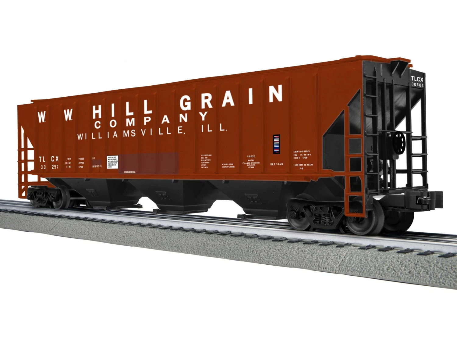 - Die-cast trucks with operating couplers and hidden tabs