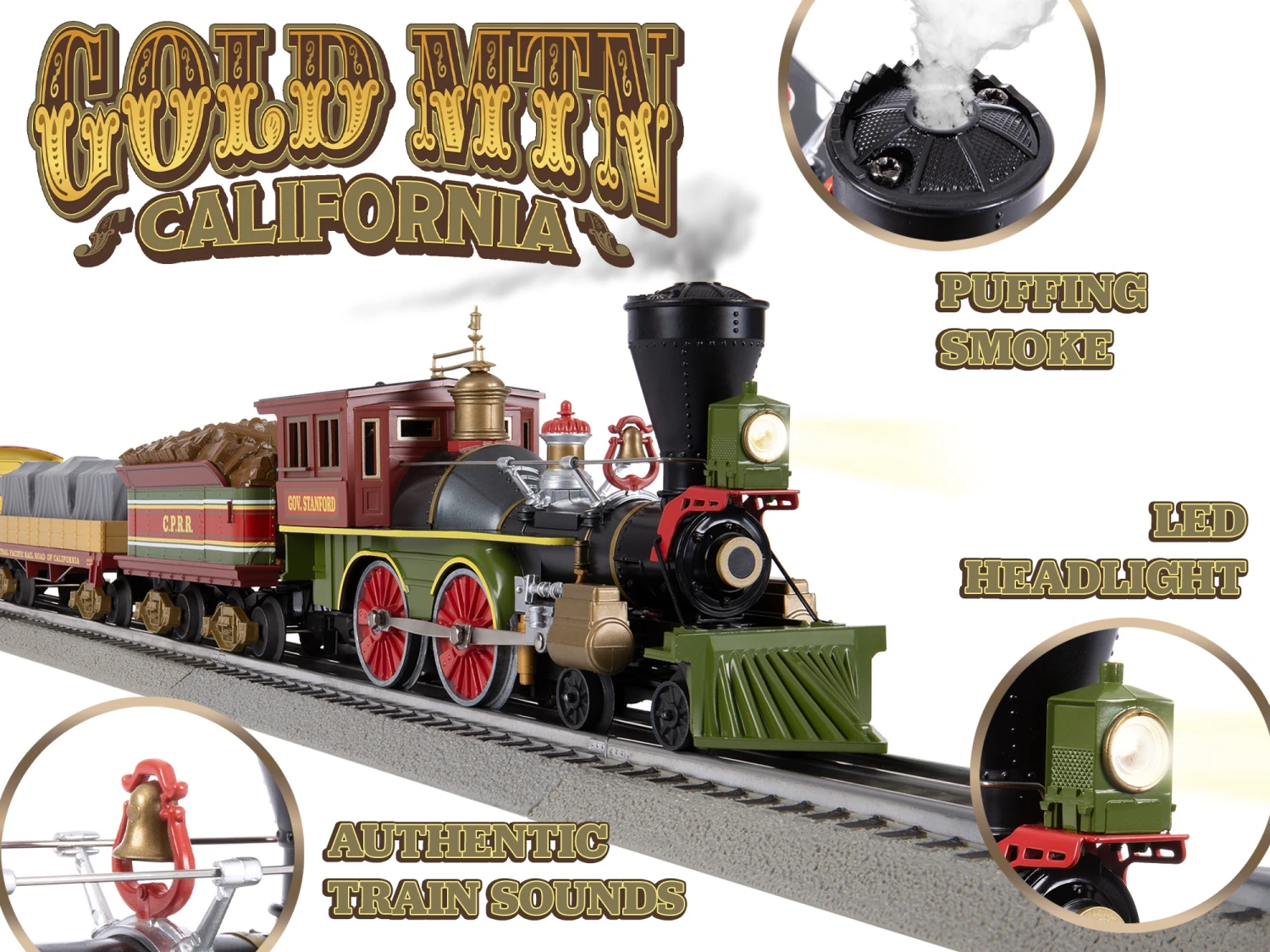 - RailSounds RCâ„¢ sound system with steam revving and background sounds, whistle, bell, and user activated announcements