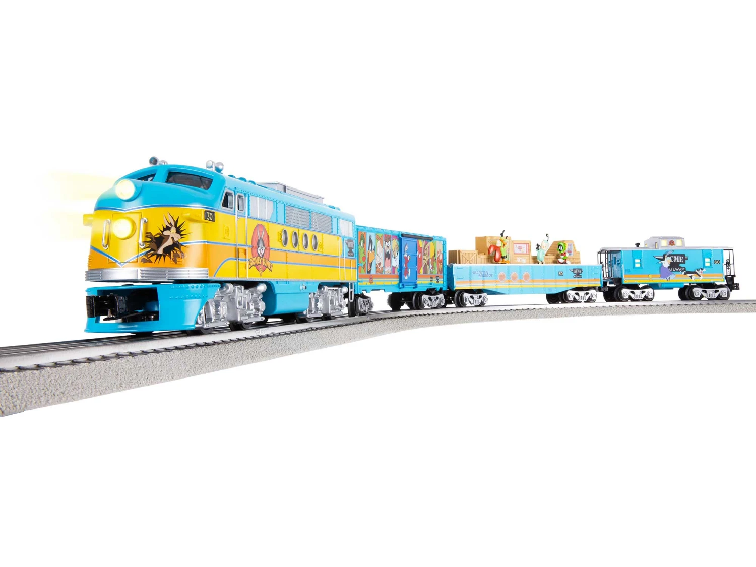 Straight out of the whimsical worldof Looney Tunes and featuringyour favorite characters, this set isa must have for collectors. This setfeatures a fantastic FT locomotivewith Roadrunner in the drivers seatand Wile E. Coyote comically caughton the front nose! It also includesa character boxcar showcasingbeloved Looney Tunes icons, a DuckDodgers-themed chasing gondolaand an illuminated caboose. Witheverything you need right in thebox, you’ll be on your way toendless fun and laughter!LOONEY TUNES and all related characters and elements © & ™ Warner Bros. Entertainment Inc. (s24)